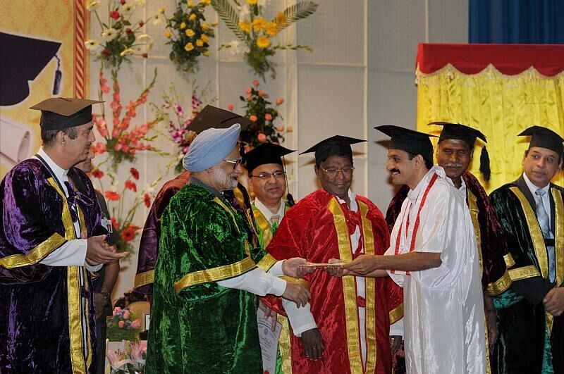पुडुचेरी में स्थित जवाहरलाल इंस्टिट्यूट ऑफ पोस्ट ग्रेजुएट मेडिकल एजुकेशन एंड रिसर्च में तीसरे दीक्षांत समारोह के मौके पर एक छात्र को डिग्री प्रदान करते प्रधानमंत्री मनमोहन सिंह।