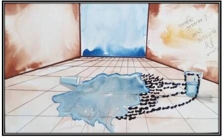 इस चित्र के माध्यम से चित्रकार कृष्णा दीक्षित समाज को बताने की कोशिश कर रहे है की पानी से भरा हुआ गिलास गिर जाता है और पानी फर्श पर फेलने लगता है और न बोलने वाले जीव जैसे सभी घरों में इधर-उधर घुमने वाली चीटियाँ सामूहिक प्रयास करते हुए जल का संरक्षण करते हुए दिखाई दे रही है, यदि बेजुबान जीव इस तरह प्रयास करके यदि जल को संरक्षित कर रहा है तो हम मनुष्य क्यों नहीं ध्यान देते है.