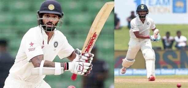 इससे पहले भारतीय कप्तान विराट कोहली ने टॉस जीतकर पहले बल्लेबाजी का फैसला किया। भारत की तरफ से आउट होने वाले पहले बल्लेबाज अभिनव मुकुंद रहे। मुकुंद को 27 के कुल स्कोर पर प्रदीप ने डिकवेला के हाथों कैच कराकर पवेलियन भेजा। मुकुंद ने 12 रन बनाए। इसके बाद सलामी बल्लेबाज धवन दोहरे शतक से चूक गये। धवन ने 168 गेंदों में 31 चौके लगाकर 190 रन बनाये। यह उनका पांचवां टेस्ट शतक है। नुवान प्रदीप ने धवन को एंजेलो मैथ्यूज के हाथों कैच कराकर 280 के कुल स्कोर पर पवेलियन भेजा। धवन और पुजारा के बीच 253 रनों की साझेदारी हुई।