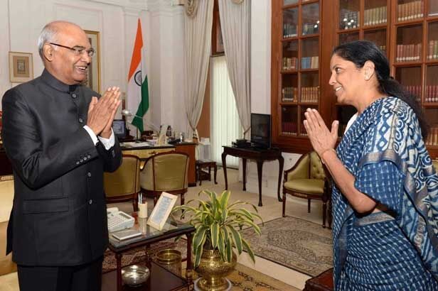 नई दिल्ली। प्रधानमंत्री नरेन्द्र मोदी के मंत्रिमंडल में नवनियुक्त रक्षा मंत्री निर्मला सीतारमण ने राष्ट्रपति रामनाथ कोविंद से मुलाकात की। कोविंद से सीतारमण की यह शिष्टाचार मुलाकात बताई जा रही है।