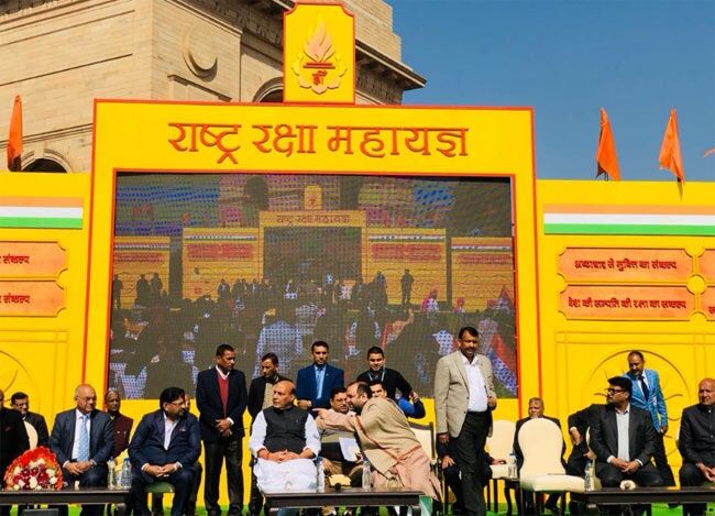 नई दिल्ली। समूचे देश को एकसूत्र में पिरोने और राष्ट्रीयता की भावना को मजबूती प्रदान करने के लिए भारतीय जनता पार्टी (भाजपा) राजधानी में ‘राष्ट्र रक्षा महायज्ञ’ करने जा रही है । इस महायज्ञ में कुंडों के निर्माण के लिए देश के हर कोने से जल और मिट्टी एकत्र की जाएगी। इसके लिए केंद्रीय गृहमंत्री राजनाथ सिंह ने बुधवार को 'जल-मिट्टी रथ यात्रा' को हरी झंडी दिखाकर रवाना किया।