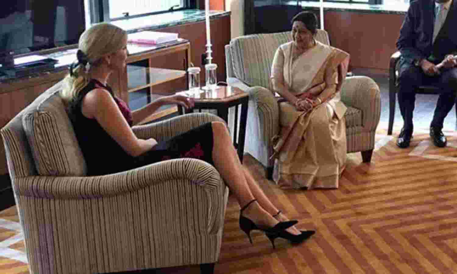 नई दिल्ली/न्यूयार्क। विदेश मंत्री सुषमा स्वराज ने अमेरिकी राष्ट्रपति डोनाल्ड ट्रम्प की बेटी इवांका ट्रम्प से मुलाकात की। दोनों के बीच महिला सशक्तिकरण सहित कई मुद्दों पर बात हुई। स्वराज ने इवांका से उनके आगामी भारत दौरे को लेकर भी बात की। इवांका ट्रंप 28 नवंबर को भारत आ रही हैं, जहां वो ग्लोबल एन्त्राप्योनोर सम्मिट (जीईसी) में अमेरिकी प्रतिनिधिमंडल का नेतृत्व करेंगी। दोनों के बीच लंबी बातचीत हुई। इस दौरान भारत में अमेरिकी राजदूत नवतेज सरना भी मौजूद थे।