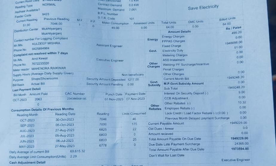 बताया जाता है कि जिस उपभोक्ता का बिजली विभाग ने 19 लाख 73 हजार 594 रुपए का बिल दिया गया है वह जिला अस्पताल सतना के सामने मोबाइल रिपेयरिंग और फोटो कॉपी की दुकान चलाते हैं। उन्होंने बिजली कंपनी से कनेक्शन आईवीआर एस क्रमांक एन 1906001742 ले रखा है। इस कनेक्शन पर पिछले महीने तक अधिकतम 2089 रुपए बिल आता था। वहीं दिसंबर माह की बिल 19 लाख 73 हजार 594 रुपए देखकर उसके होश उड़ गए। जिसके बाद दुकान संचालक अब्दुल मजीद पिता अब्दुल हमीद निवासी रामना टोला सतना ने इस मामले की कंप्लेन अधिकारी से की। इस बीच उन्हें सही समाधान बताने की बजाय एक दूसरे पर जिम्मेदारी थोपने की कोशिश होती रही।