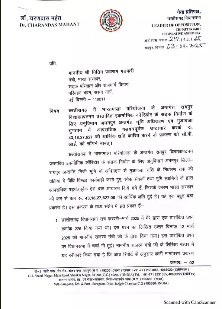 |Demand for CBI Investigation in Bharatmala Project Scam : रायपुर। छत्तीसगढ़ में भारतमाला परियोजना में कथित भ्रष्टाचार के मामले ने तूल पकड़ लिया है। आज, 4 अप्रैल 2025 को छत्तीसगढ़ विधानसभा के नेता प्रतिपक्ष डॉ. चरणदास महंत ने केंद्रीय सड़क परिवहन और राजमार्ग मंत्री नितिन गडकरी को एक पत्र लिखकर इस परियोजना में हुई अनियमितताओं की जांच केंद्रीय जांच ब्यूरो (सीबीआई) से कराने की मांग की है।