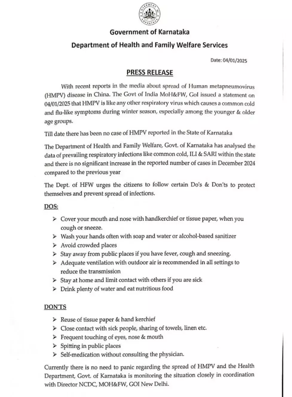 वायरस के प्रसार को रोकने के लिए सभी लोगों को सामान्य स्वच्छता और सावधानी बरतने की आवश्यकता है, जैसे कि हाथों को अच्छे से धोना, खांसते और छींकते समय मुंह और नाक को ढकना, और संक्रमित व्यक्तियों से दूरी बनाए रखना। इसके अलावा यदि किसी को बुखार, गले में खराश या सांस लेने में परेशानी हो, तो उसे चिकित्सकीय सलाह लेने की सलाह दी जाती है।