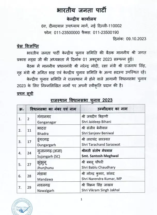 राजस्थान में भाजपा ने जारी की उम्मीदवारों की पहली लिस्ट, मप्र की तर्ज पर 7 सांसदों को मैदान में उतारा