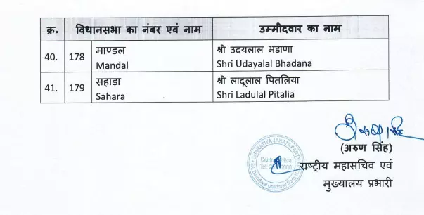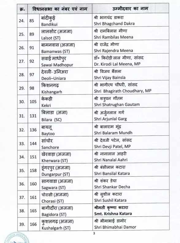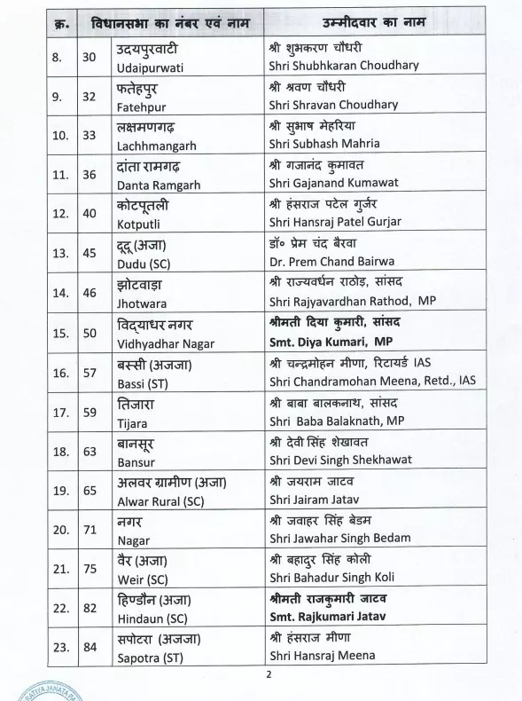 आगामी विधानसभा चुनाव के लिए भाजपा ने झोटवाड़ा से राज्यवर्धन सिंह राठौड़, विद्याधर नगर से दीया कुमारी, तिजारा से बाबा बालकनाथ, मंडावा से नरेंद्र कुमार, संचोरी से देवजी पटेल, सपोटरा से हंसराज मीना और सवाई माधोपुर से किरोड़ी लाल मीना को चुनावी मैदान में उतारा गया है।