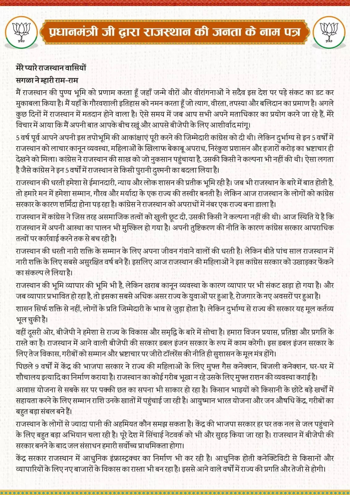 प्रधानमंत्री ने लिखा कि मेरे प्यारे राजस्थान वासियों, सगला ने म्हारी राम-राम। राजस्थान की पुण्य भूमि को प्रणाम करता हूं, जहां जन्मे वीरों और वीरांगनाओं ने सदैव इस देश पर पड़े संकट का डट कर मुकाबला किया है। मैं यहां के गौरवशाली इतिहास को नमन करता हूं जो त्याग, वीरता, तपस्या और बलिदान का प्रमाण है। अगले कुछ दिनों में राजस्थान में मतदान होने वाला है, ऐसे समय में जब आप सभी अपने मताधिकार का प्रयोग करने जा रहे हैं, मेरे विचार में आया कि मैं अपनी बात आपके बीच रखूं और आपसे भाजपा के लिए आशीर्वाद मांगू। पांच वर्ष पूर्व आपने अपनी इस तपोभूमि की आकांक्षाएं पूरी करने की जिम्मेदारी कांग्रेस को दी थी, लेकिन दुर्भाग्य से इन पांच वर्षों में राजस्थान को लाचार कानून व्यवस्था, महिलाओं के खिलाफ बेकाबू अपराध, निरंकुश प्रशासन और हजारों करोड़ का भ्रष्टाचार ही देखने को मिला। कांग्रेस ने राजस्थान की साख को जो नुकसान पहुंचाया है उसकी किसी ने कल्पना भी नहीं की थी। ऐसा लगता है जैसे कांग्रेस ने इन पांच वर्षों में राजस्थान से किसी पुरानी दुश्मनी का बदला लिया है।