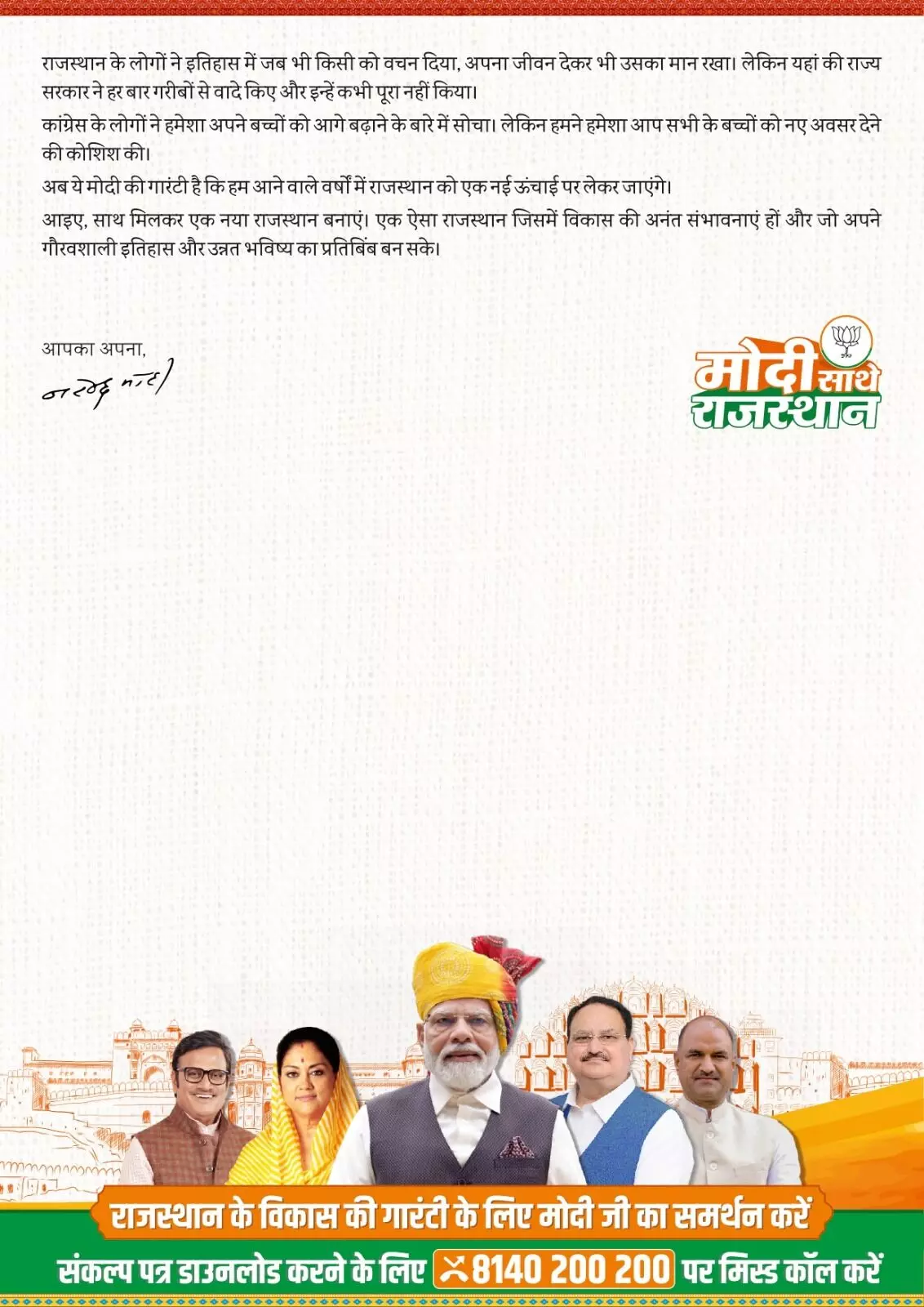 प्रधानमंत्री ने लिखा कि राजस्थान के लोगों ने इतिहास में जब भी किसी को वचन दिया, अपना जीवन देकर भी उसका मान रखा, लेकिन यहां की कांग्रेस सरकार ने हर बार गरीबों से वादे किए और इन्हें कभी पूरा नहीं किया। कांग्रेस के लोगों ने हमेशा अपने बच्चों को आगे बढ़ाने के बारे में सोचा, लेकिन हमने हमेशा आप सभी के बच्चों को नए अवसर देने की कोशिश की। अब ये मोदी की गारंटी है कि हम आने वाले वर्षों में राजस्थान को एक नई ऊंचाई पर लेकर जाएंगे। आइए, साथ मिलकर एक नया राजस्थान बनाएं। एक ऐसा राजस्थान जिसमें विकास की अनंत संभावनाएं हों और जो अपने गौरवशाली इतिहास और उन्नत भविष्य का प्रतिबिंब बन सके।
