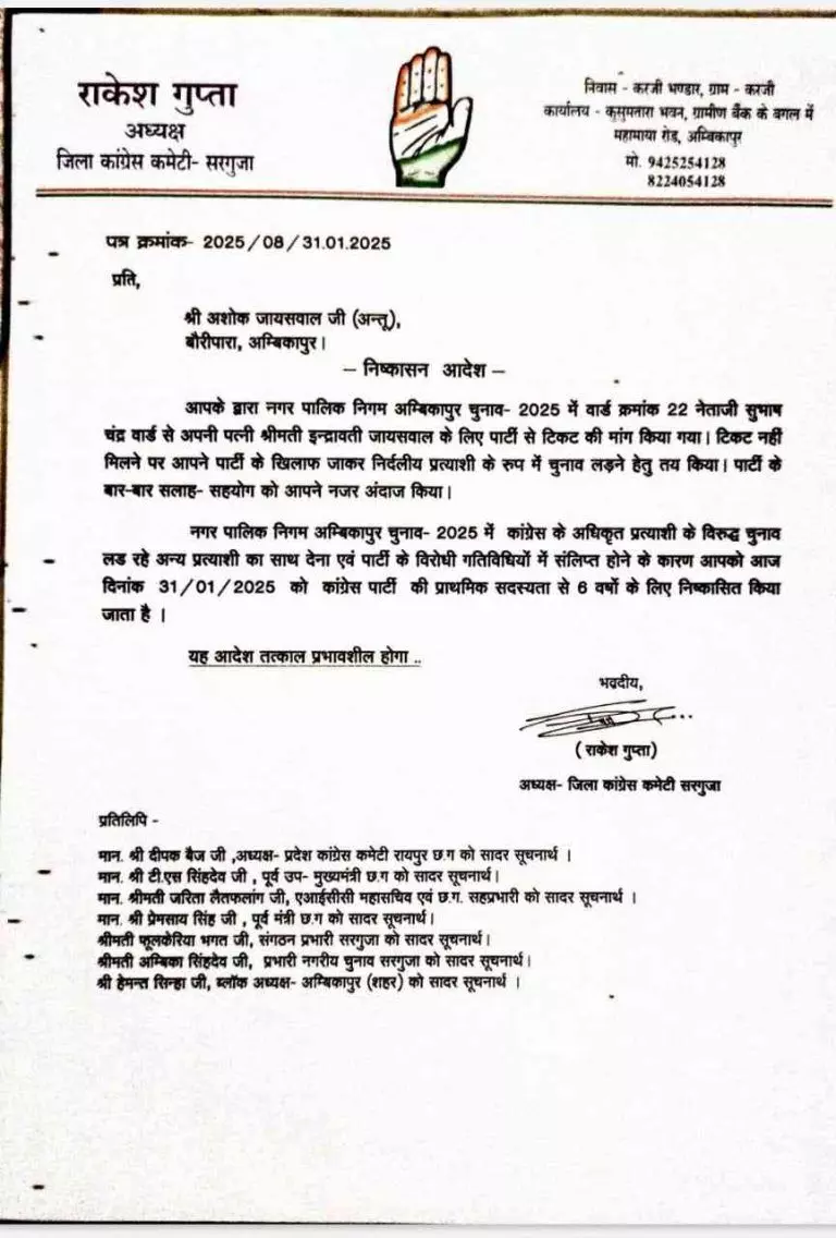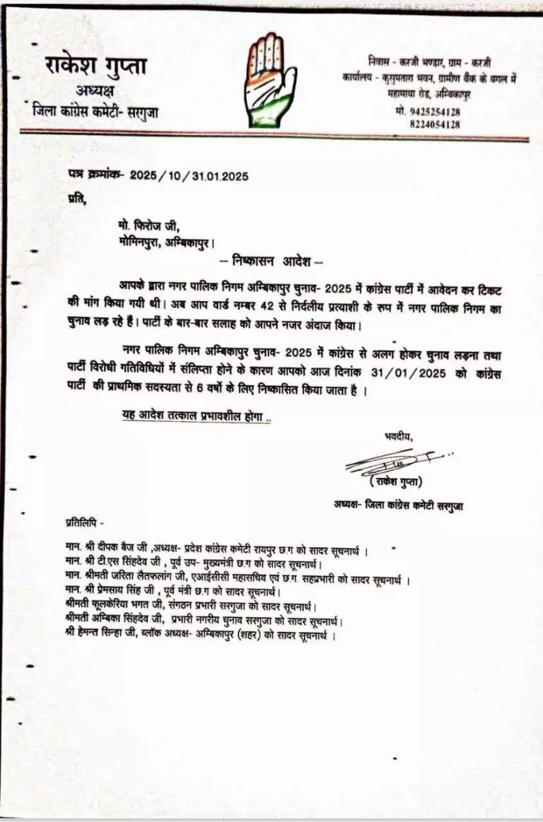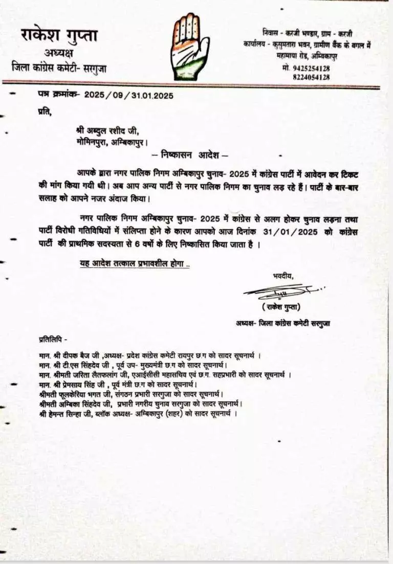 जानकारी के अनुसार सरगुजा से जिला अध्यक्ष राकेश गुप्ता ने अशोक जायसवाल, अब्दुल रशीद और फिरोज को कांग्रेस से निष्काषित कर दिया है। बता दें कि, ये तीनों कांग्रेस के अधिकृत प्रत्याशी होने के बावजूद पार्षद का चुनाव लड़ रहे हैं।