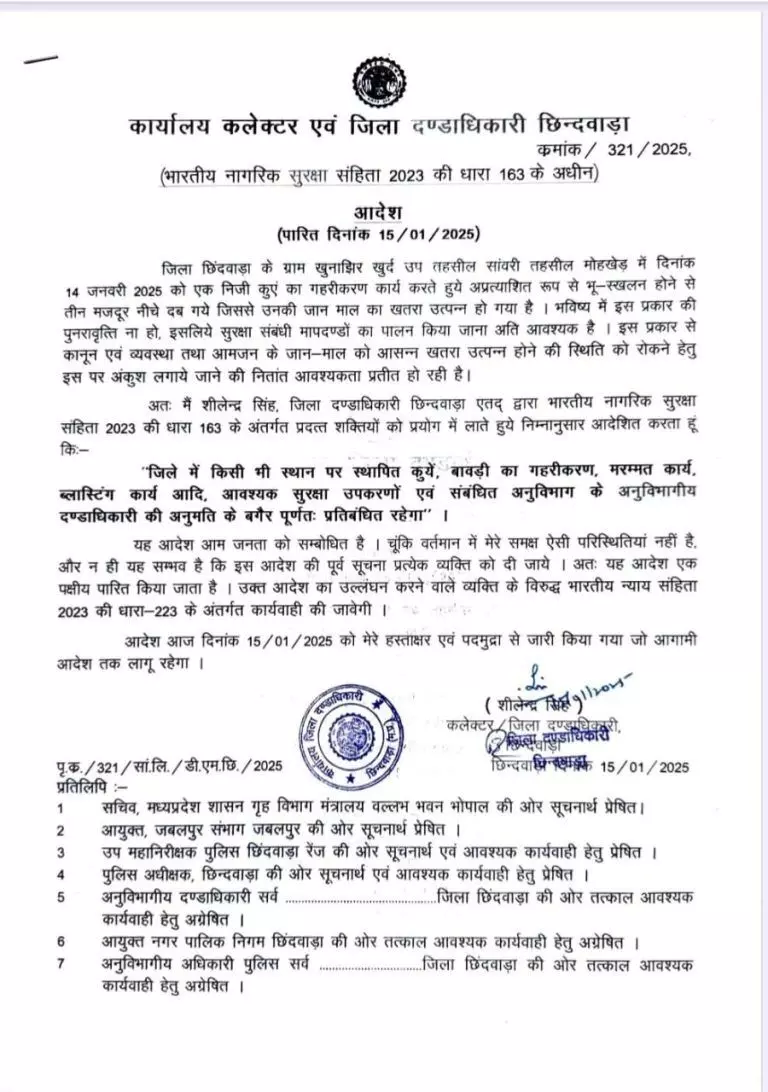 |Chhindwara Well Accident : मध्य प्रदेश। छिंदवाड़ा कुंआ हादसे में तीन मजदूरों की मौत बाद जिला प्रशासन सख्त एक्शन लिया है। कलेक्टर शैलेंद्र सिंह (Collector Shailendra Singh) ने आदेश जारी किया है, जिसमें बिना अनुमति के कुएं और बावड़ी के गहरीकरण कार्यों पर रोक लगाई गई है। इन कार्यों के लिए अब अनुविभागीय अधिकारी से अनुमति लेना अनिवार्य कर दिया गया है।