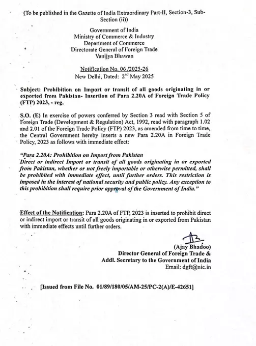 वाणिज्य मंत्रालय के नोटिफिकेशन के अनुसार, भारत ने पाकिस्तान से सभी वस्तुओं के डायरेक्ट या इनडायरेक्ट आयात पर तत्काल प्रभाव से प्रतिबंध लगा दिया है। विदेश व्यापार नीति (FTP) 2023 में इस संबंध में एक प्रावधान जोड़ा गया है। जिसमें कहा गया है कि अगले आदेश तक तत्काल प्रभाव से पाकिस्तान से आने वाले या निर्यात किए जाने वाले सभी सामानों के डायरेक्ट या इनडायरेक्ट आयात पर प्रतिबंध लगाया जा रहा है। यह 2 मई की अधिसूचना में जानकारी दी गई है।