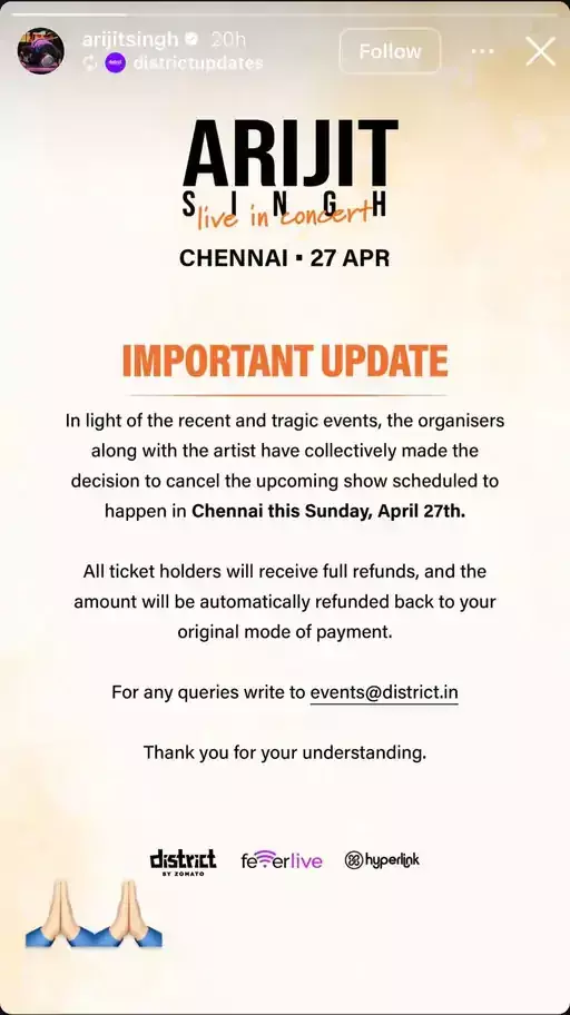 सिंगर अरिजीत सिंह ने अपने इंस्टाग्राम स्टोरी पर कॉन्सर्ट के आयोजकों का एक पोस्ट री-शेयर किया, जिसमें लिखा था, 'एक जरूरी अपडेट- हाल की दुखद घटना (पहलगाम आतंकी हमला) को देखते हुए आयोजकों ने कलाकारों के साथ मिलकर रविवार, 27 अप्रैल को चेन्नई में होने वाले शो को रद्द करने का निर्णय लिया है। जिन लोगों ने टिकट खरीदे हैं, उन्हें पूरा रिफंड मिल जाएगा। आपने स्थिति समझी, उसके लिए धन्यवाद।'