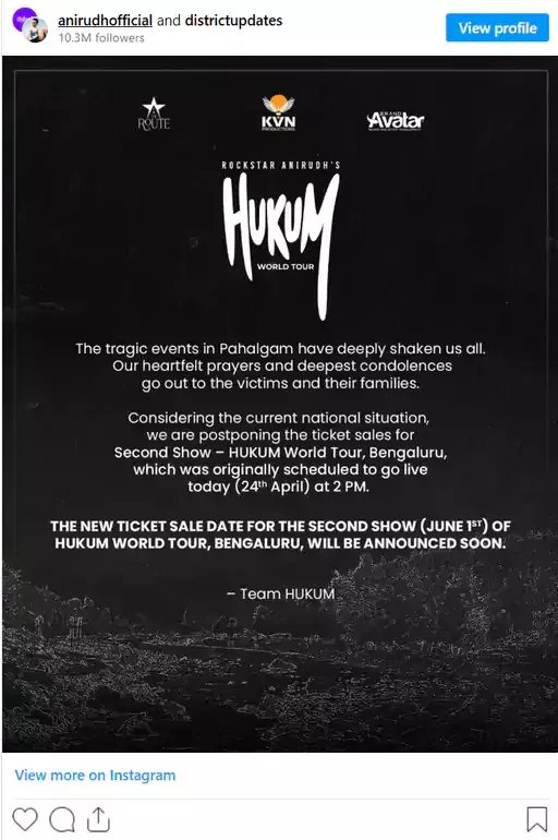 अरिजीत सिंह के अलावा म्यूजिक कंपोजर और सिंगर अनिरुद्ध रविचंदर ने भी बेंगलुरु में हुकुम टूर के लिए टिकटों की बिक्री को स्थगित कर दिया। इस बारे में उन्होंने इंस्टाग्राम पर जानकारी दी। उन्होंने लिखा, ‘पहलगाम में हुई दुखद घटना (पहलगाम आतंकी हमला) ने हमें सभी को बहुत झकझोर दिया है। हमारी हार्दिक प्रार्थनाएं और गहरी संवेदनाएं पीड़ितों और उनके परिवारों के साथ हैं।'
