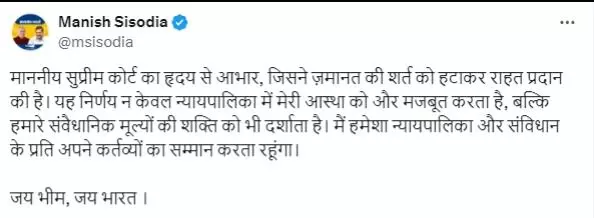 मनीष सिसोदिया ने बुधवार को सोशल मीडिया अकाउंट पर पोस्ट साझा कर कहा कि, माननीय सुप्रीम कोर्ट का हृदय से आभार, जिसने ज़मानत की शर्त को हटाकर राहत प्रदान की है। यह निर्णय न केवल न्यायपालिका में मेरी आस्था को और मजबूत करता है, बल्कि हमारे संवैधानिक मूल्यों की शक्ति को भी दर्शाता है। मैं हमेशा न्यायपालिका और संविधान के प्रति अपने कर्तव्यों का सम्मान करता रहूंगा।