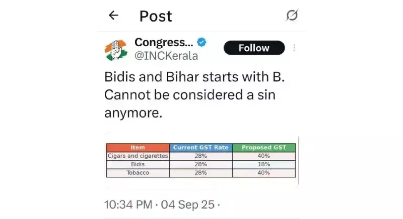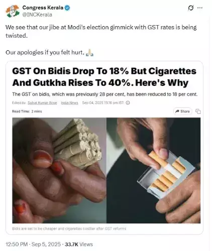 उन्होंने लिखा, "अगर इससे किसी को ठेस पहुंची तो हम क्षमा मांगते हैं।"उल्लेखनीय है कि केरल कांग्रेस ने अपने एक्स अकाउंट पर एक चार्ट साझा किया था, जिसमें सिगरेट, तंबाकू और बीड़ी पर जीएसटी दरों की तुलना की गई थी। चार्ट के मुताबिक, सिगरेट और तंबाकू पर जीएसटी 28 से बढ़ाकर 40 फीसदी किया गया, जबकि बीड़ी पर जीएसटी 28 फीसदी से घटाकर 18 फीसदी कर दिया गया। पोस्ट में लिखा गया, "बीड़ी और बिहार दोनों 'बी' से शुरू होते हैं, अब इन्हें पाप नहीं माना जा सकता।"