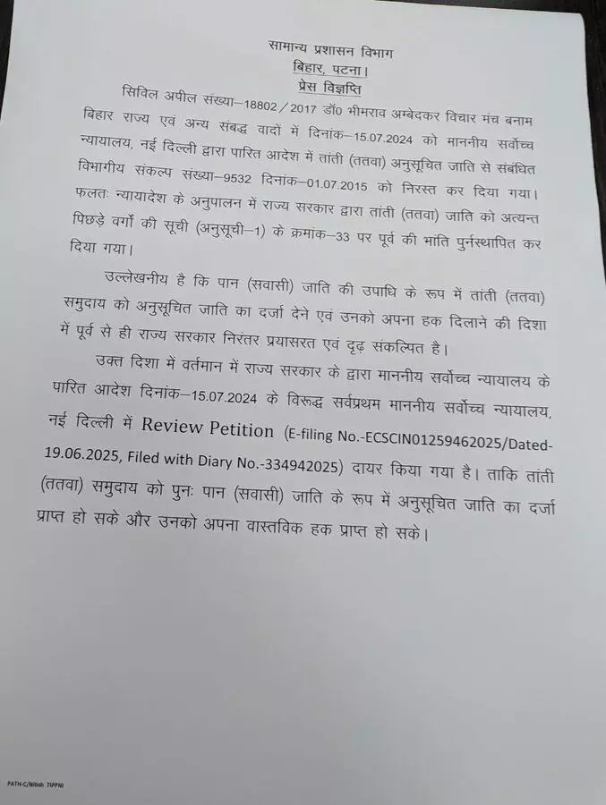 जारी किये गए आदेश में कहा गया है कि, राज्य सरकार के द्वारा सर्वोच्च न्यायालय के पारित आदेश दिनांक-15 जुलाई 2024 के विरूद्ध सर्वप्रथम सर्वोच्च न्यायालय नई दिल्ली में रिव्यु पिटीशन दायर की गई है ताकि तांती (ततवा) समुदाय को पुनः पान (सवासी) जाति के रूप में अनुसूचित जाति का दर्जा प्राप्त हो सके और उनको अपना वास्तविक हक प्राप्त हो सके।