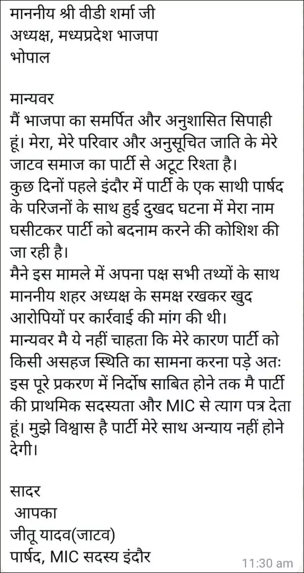 सोशल मीडिया पर जीतू यादव का इस्तीफा वायरल हो रहा है। बताया जा रहा है कि उन पर केस भी दर्ज हो सकता है। बताया जा रहा है कि, पीएम कार्यालय से भी दोनों भाजपा पार्षदों के विवाद की रिपोर्ट मांगी गई है।