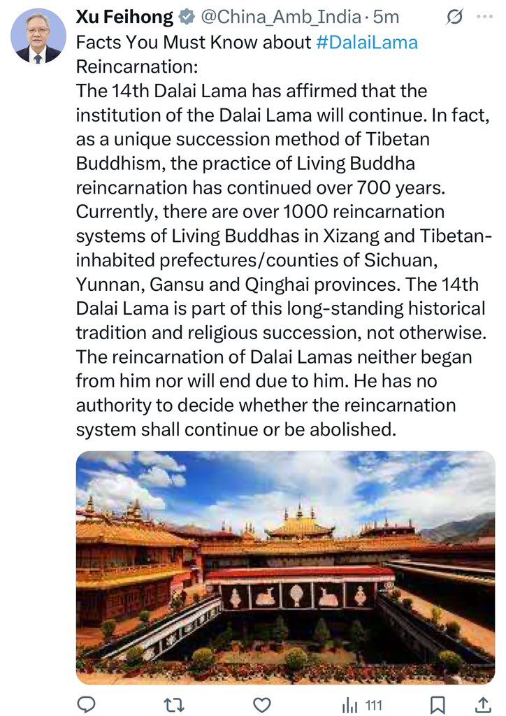 भारत में चीन के राजदूत Xu Feihong ने एक्स पर ट्वीट करते हुए कहा कि, 'पुनर्जन्म प्रणाली जारी रखने या समाप्त करने का निर्णय लेने का अधिकार दलाई लामा को नहीं है।'