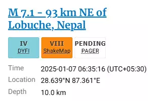 भूकंपीय गतिविधि की तीव्रता 7.1 दर्ज की गई। USGS ने बताया कि भूकंप 7 जनवरी को नेपाल-तिब्बत सीमा के पास सुबह 6:35 बजे आया। बिहार के शिवहर में भी भूकंप के झटके महसूस किए गए।