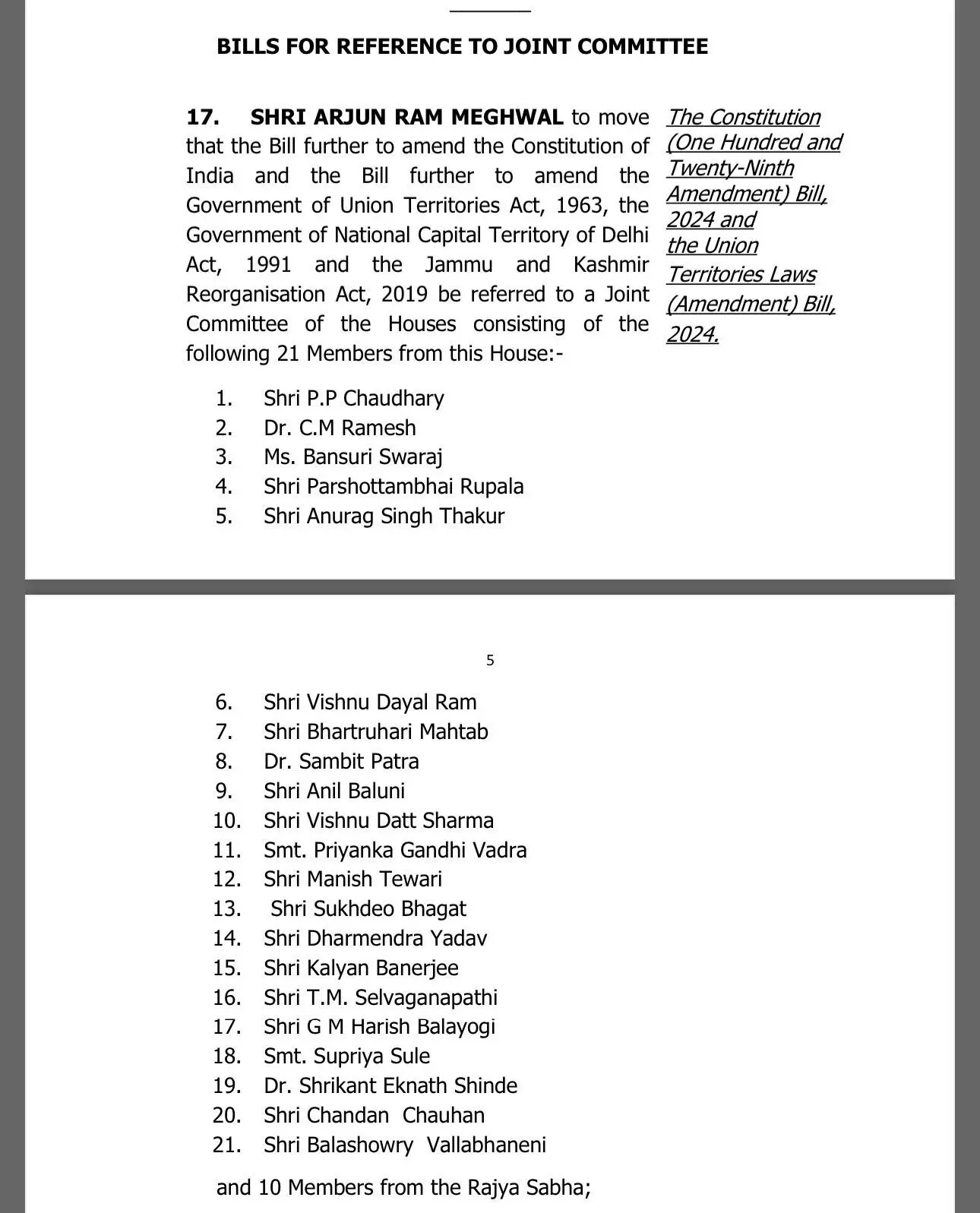 वन नेशन-वन इलेक्शन बिल के लिए गठित संयुक्त संसदीय समिति (जेपीसी) में लोकसभा के 21 सदस्य शामिल हैं। इनमें पी.पी. चौधरी, सी.एम. रमेश, बांसुरी स्वराज, पुरुषोत्तमभाई रुपाला, अनुराग ठाकुर, विष्णु दयाल राम, भतृहरि महताब, संबित पात्रा, अनिल बलूनी, विष्णु दत्त शर्मा, प्रियंका गांधी वाड्रा, मनीष तिवारी, सुखदेव भगत, धर्मेंद्र यादव, कल्याण बनर्जी, टी.एम. सेल्वागणपति, जी.एम. हरीश बालयोगी, सुप्रिया सुले, श्रीकांत एकनाथ शिंदे, चंदन चौहान और बालशौरी वल्लभानेनी के नाम शामिल हैं।