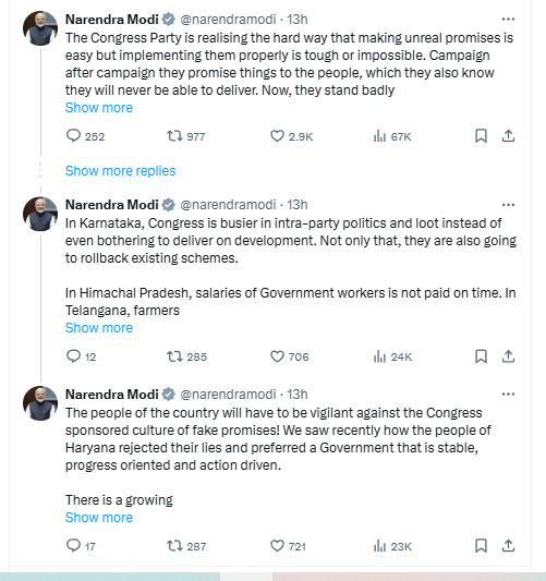 पीएम मोदी ने बताया कि छत्तीसगढ़ और राजस्थान में कांग्रेस ने 5 साल पहले कुछ भत्तों का वादा किया था, जो आज तक पूरे नहीं हुए। ऐसे कई उदाहरण हैं जहां कांग्रेस सरकारों ने जनता से किए गए वादों को दरकिनार किया है। पीएम ने यह भी कहा कि हिमाचल प्रदेश, कर्नाटक और तेलंगाना जैसे राज्यों में कांग्रेस की सरकारें राज्य की आर्थिक हालत और विकास दर को खराब कर रही हैं।