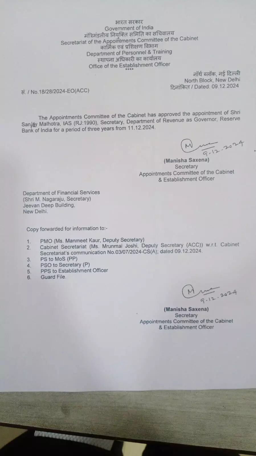 जानकारी के अनुसार, संजय मल्होत्रा बुधवार यानी 11 दिसंबर को नए गवर्नर का पदभार संभालेंगे। संजय मल्होत्रा 1990 बैच के आईएएस अधिकारी रहे हैं। उनकी नियुक्ति 3 साल के लिए की गई है। फिलहाल वह राजस्व सचिव के पद पर हैं।