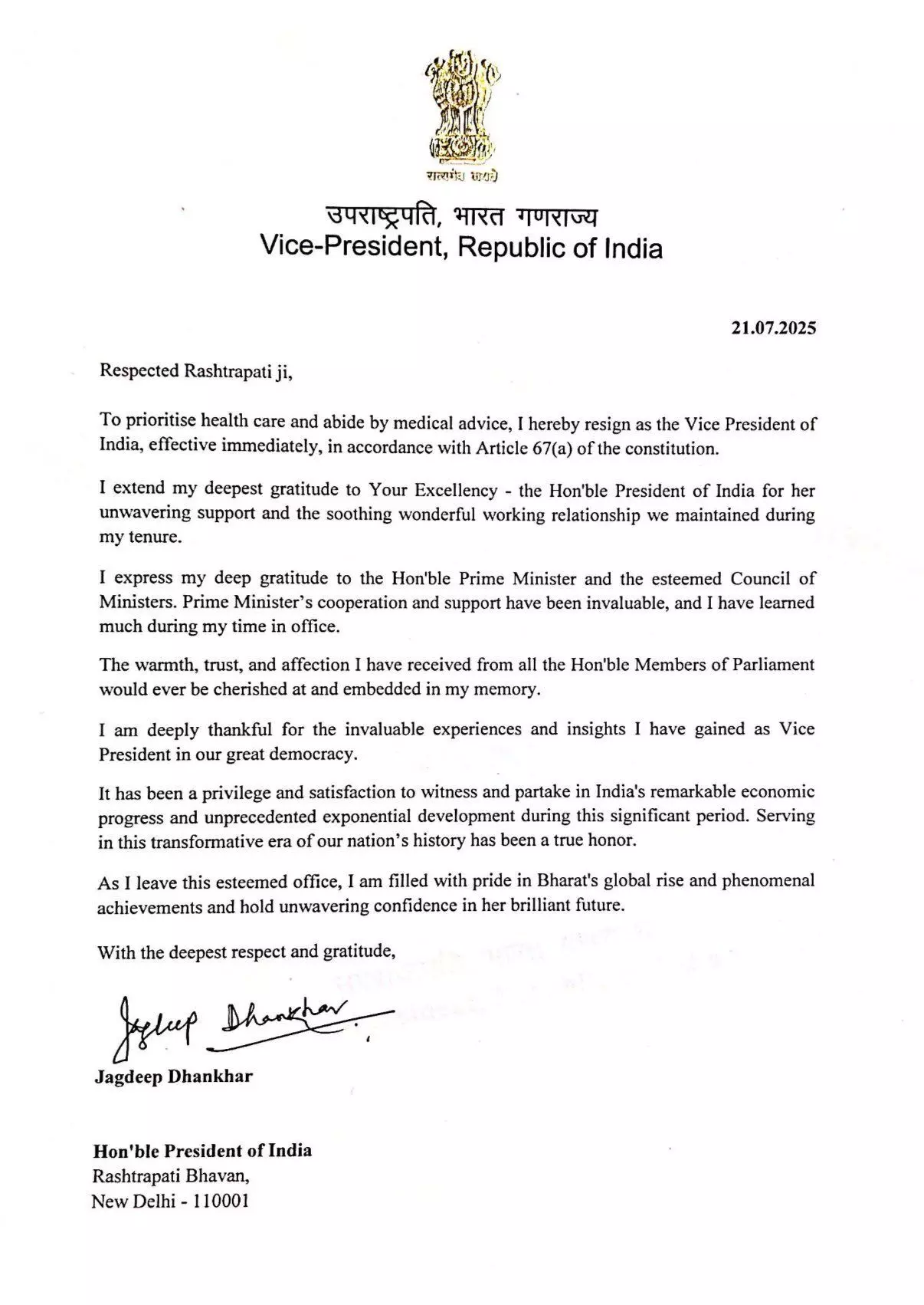 धनखड़ ने अपने पत्र में आग्रह किया है कि उनका इस्तीफा तत्काल प्रभाव से स्वीकार किया जाए। उन्होंने इस फैसले के लिए भारतीय संविधान के अनुच्छेद 67(ए) का उल्लेख किया है।