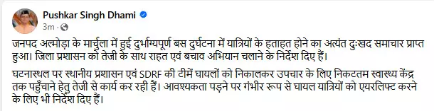उत्तराखंड सीएम पुष्कर सिंह धामी ने सोशल मीडिया X पर पोस्ट किया कि, अल्मोड़ा जिले के मरचूला में हुई बस दुर्घटना में लोगों के हताहत होने की अत्यंत दुःखद सूचना प्राप्त हुई है। जिला प्रशासन को राहत एवं बचाव कार्य तेजी से संचालित करने के निर्देश दिए गए हैं। घटना स्थल पर स्थानीय प्रशासन और एसडीआरएफ की टीमें घायलों को निकालने और उन्हें उपचार के लिए नजदीकी स्वास्थ्य केंद्र पहुंचाने के लिए तेजी से काम कर रही हैं। आवश्यकता पड़ने पर गंभीर रूप से घायल यात्रियों को एयरलिफ्ट करने के भी निर्देश दिए गए हैं।