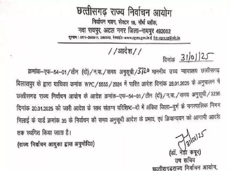 CG NEWS: भिलाई नगर निगम के वार्ड 35 का उपचुनाव स्थगित, हाईकोर्ट ने निर्वाचन आयोग को दिया निर्देश