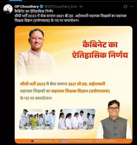 मंत्रिपरिषद की बैठक में सीधी भर्ती 2023 में नियुक्ति उपरांत सेवा समाप्त किये गये 2621 बी.एड. अर्हताधारी सहायक शिक्षकों के हित में महत्वपूर्ण फैसला लेते हुए उनको अंतर्विभागीय समिति की अनुशंसा अनुसार सहायक शिक्षक विज्ञान (प्रयोगशाला) के पद पर समायोजन करने का निर्णय लिया गया। इसके लिए स्कूल शिक्षा विभाग को अधिकृत किया गया है।