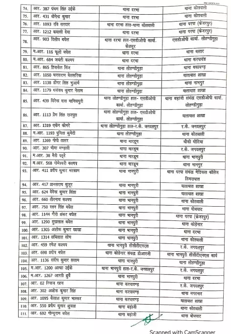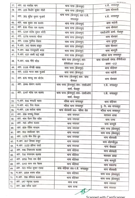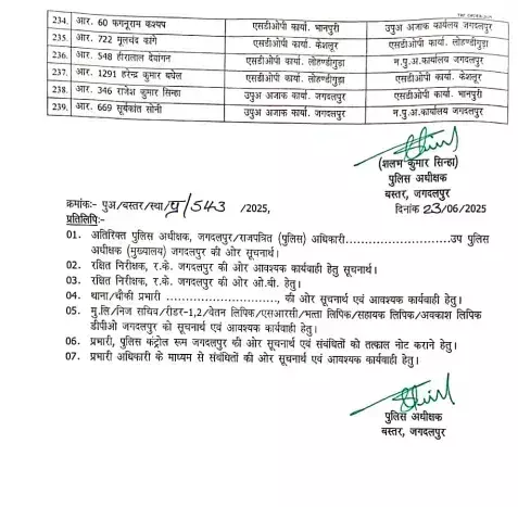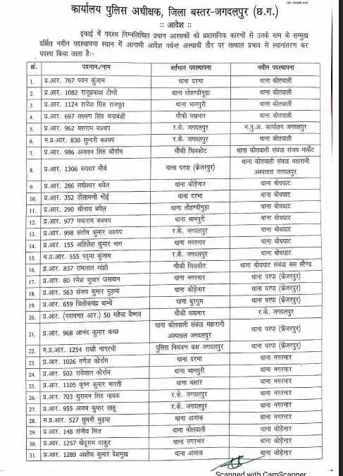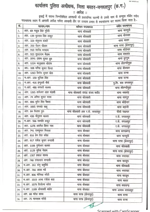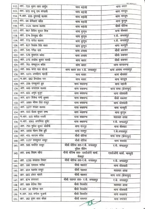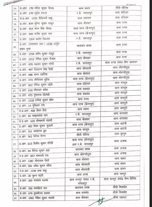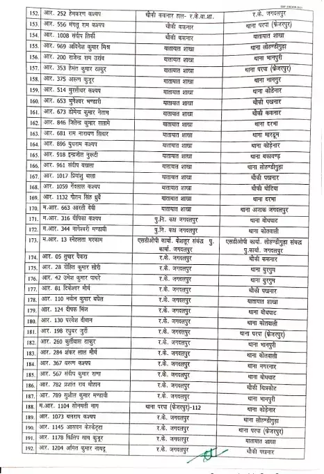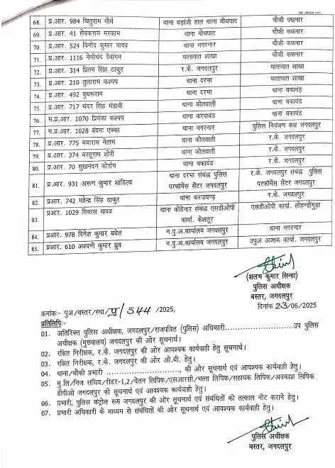 इस तबादला सूची में कोतवाली, बोधघाट, नगरनार जैसे शहरी थानों में लंबे समय से तैनात पुलिसकर्मियों को अब ग्रामीण क्षेत्रों के थानों में स्थानांतरित किया गया है। इस कदम का मुख्य उद्देश्य पुलिस व्यवस्था में संतुलन, पारदर्शिता और जवाबदेही को बढ़ावा देना है।
