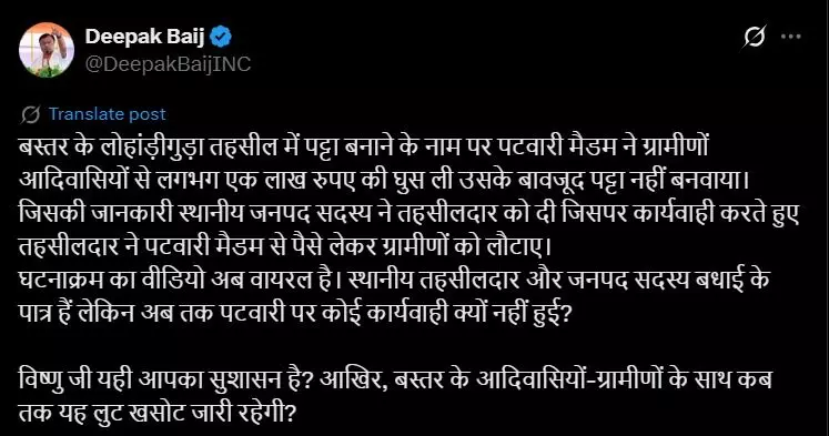 उन्होंने तहसीलदार और जनपद सदस्य की तारीफ की, लेकिन सवाल उठाया कि पटवारी पर अब तक कोई कार्रवाई क्यों नहीं हुई? बैज ने मुख्यमंत्री विष्णु देव साय से पूछा, "यही आपका सुशासन है? बस्तर के आदिवासियों के साथ यह लूट-खसोट कब तक चलेगी?"