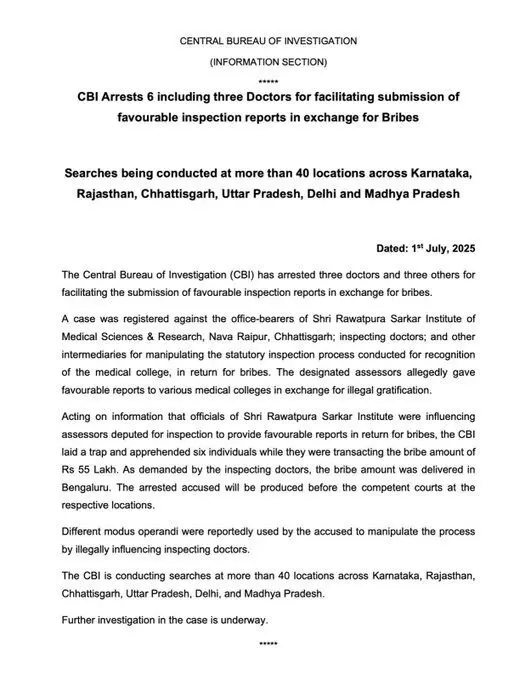 केंद्रीय जांच ब्यूरो (सीबीआई) ने बताया कि, रिश्वत के बदले अनुकूल निरीक्षण रिपोर्ट प्रस्तुत करने में मदद करने के आरोप में तीन डॉक्टरों और तीन अन्य को गिरफ्तार किया है। श्री रावतपुरा सरकार इंस्टीट्यूट ऑफ मेडिकल साइंसेज एंड रिसर्च, नवा रायपुर, छत्तीसगढ़ के पदाधिकारियों, निरीक्षण करने वाले डॉक्टरों और अन्य बिचौलियों के खिलाफ रिश्वत के बदले मेडिकल कॉलेज की मान्यता के लिए आयोजित वैधानिक निरीक्षण प्रक्रिया में हेराफेरी करने का मामला दर्ज किया गया है। नामित मूल्यांकनकर्ताओं ने कथित तौर पर अवैध रिश्वत के बदले विभिन्न मेडिकल कॉलेजों को अनुकूल रिपोर्ट दी।