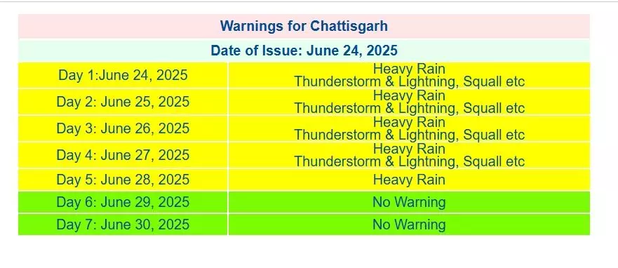 |CG Heavy Rain Yellow Alert : रायपुर। छत्तीसगढ़ में आज मौसम विभाग ने छह जिलों - गरियाबंद, बलौदाबाजार, कोरबा, गौरेला-पेंड्रा-मारवाही, सूरजपुर और बलरामपुर - में भारी बारिश का यलो अलर्ट जारी किया है। इसके साथ ही, राज्य के 27 जिलों में गरज-चमक के साथ बिजली गिरने की संभावना जताई गई है। लोगों को सतर्क रहने और बिजली गिरने से बचने के लिए सुरक्षित स्थानों पर रहने की सलाह दी गई है।