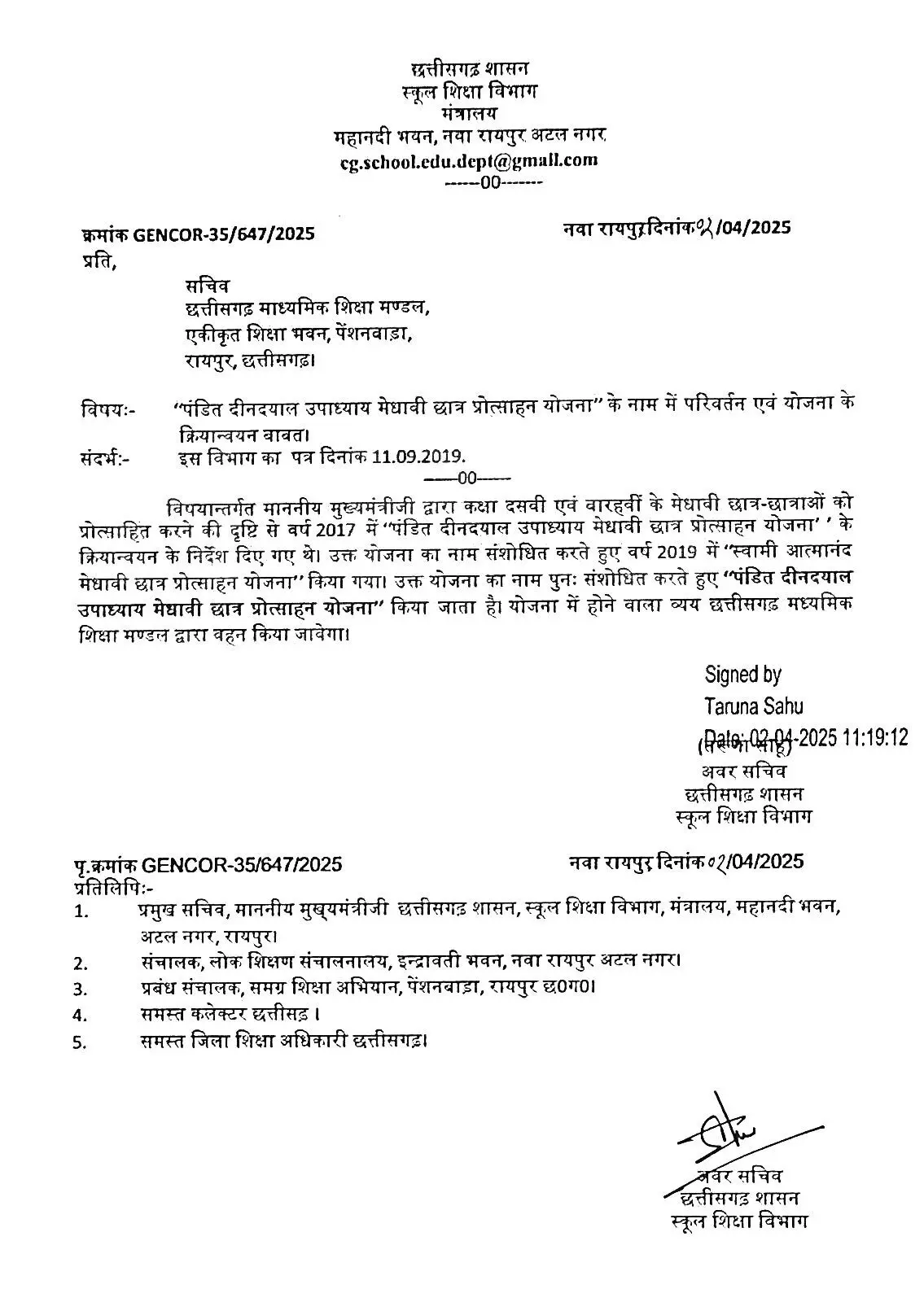 उक्त योजना का नाम संशोधित करते हुए वर्ष 2019 में "स्वामी आत्मानंद मेधावी छात्र प्रोत्साहन योजना" किया गया। उक्त योजना का नाम पुनः संशोधित करते हुए "पंडित दीनदयाल उपाध्याय मेधावी छात्र प्रोत्साहन योजना" किया जाता है। योजना में होने वाला व्यय छत्तीसगढ़ मध्यमिक शिक्षा मण्डन द्वारा वहन किया जावेगा।