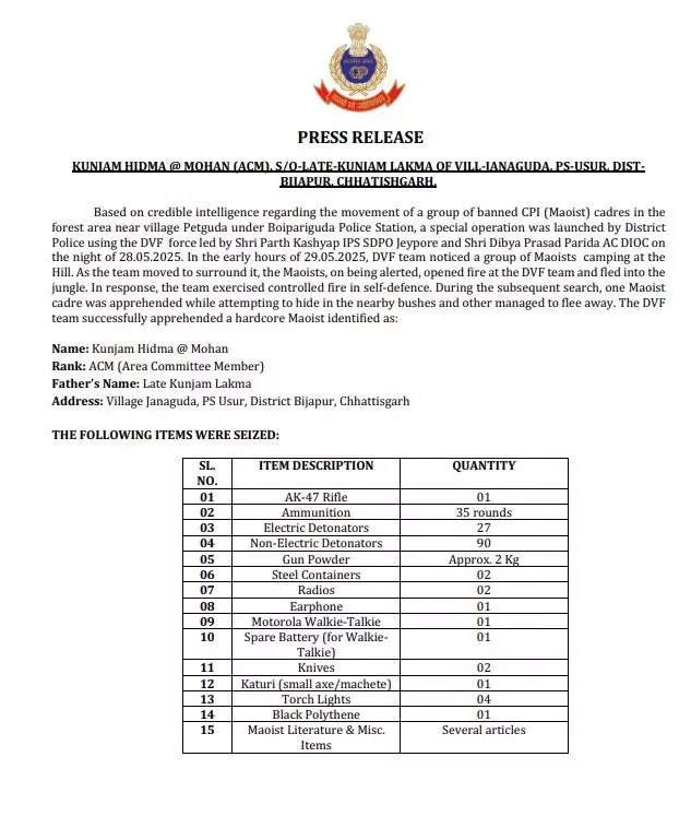 पुलिस ने उसकी गिरफ्तारी के दौरान बड़ी मात्रा में माओवादी सामग्री और हथियार भी बरामद किए हैं। जब्त सामानों में एक AK-47 राइफल, 35 राउंड गोलियां, 117 डेटोनेटर (इलेक्ट्रिक और नॉन-इलेक्ट्रिक), बारूद, रेडियो, चाकू और माओवादी साहित्य शामिल है।
