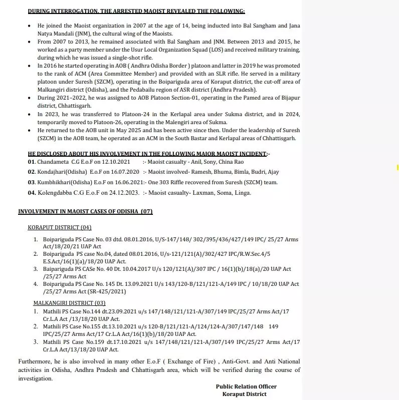 जानकारी के मुताबिक, कोरापुट पुलिस और डिस्ट्रिक्ट वॉलंटरी फोर्स (DVF) की संयुक्त कार्रवाई के दौरान खूंखार और वांटेड एरिया कमेटी सदस्य (ACM) कुंजम हिडमा उर्फ मोहन को गिरफ्तार कर लिया गया है। नक्सली नेता कुंजाम हिडमा को कोरापुट जिले के बाइपारीगुडा थाना क्षेत्र के पेटगुडा जंगल से पकड़ा गया।