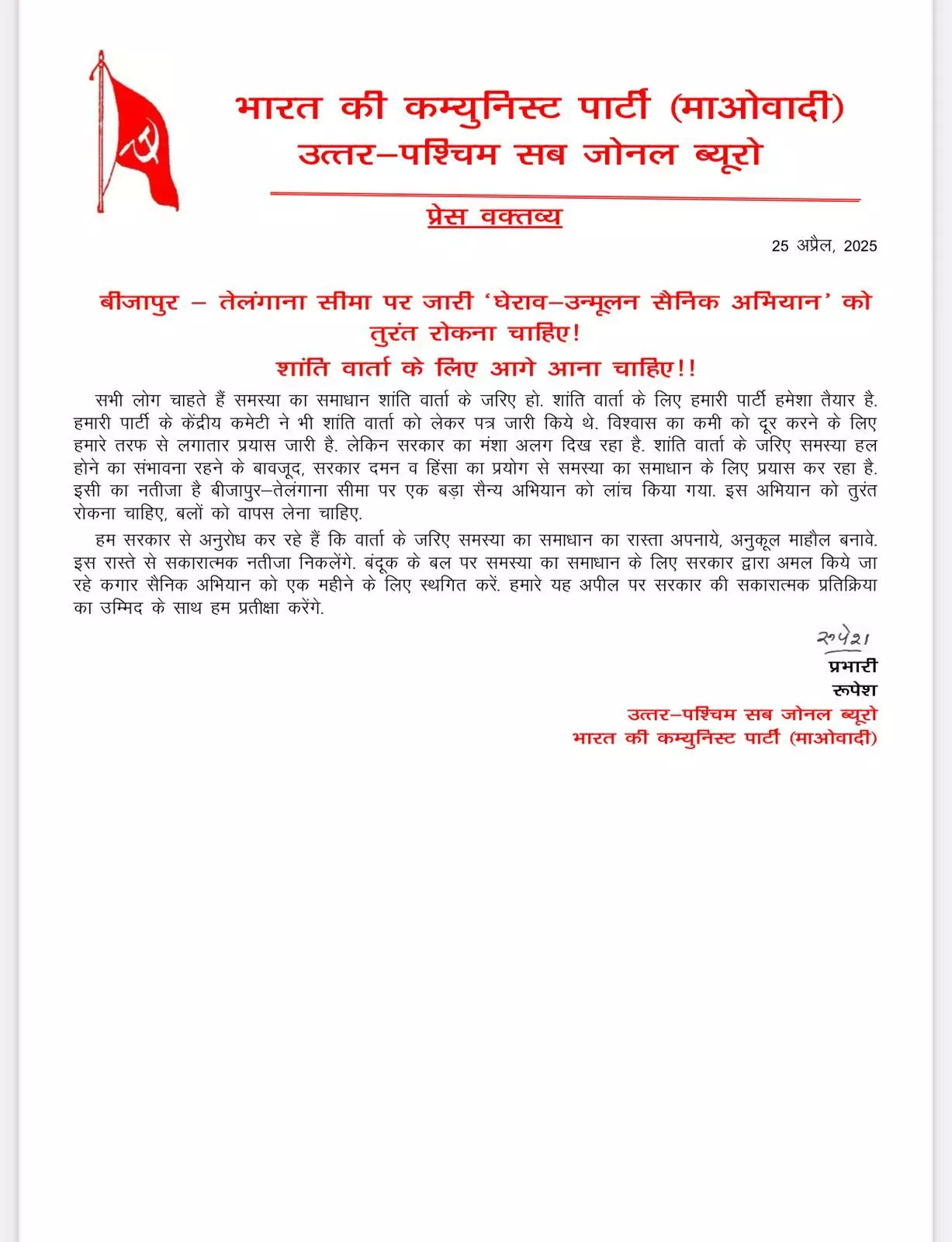 भारत की कम्युनिस्ट पार्टी (माओवादी) के उत्तर-पश्चिम सब जोनल ब्यूरो के प्रभारी रूपेश ने एक पत्र जारी कर सरकार से तत्काल शांति वार्ता शुरू करने की मांग की है। उन्होंने बीजापुर-तेलंगाना सीमा पर चल रहे संयुक्त ऑपरेशन को रोकने की अपील करते हुए कहा कि बस्तर में बंदूक से शांति नहीं लाई जा सकती। रूपेश ने दावा किया कि नक्सली पहले भी वार्ता के लिए तैयार थे, लेकिन सरकार ने कोई सकारात्मक कदम नहीं उठाया।