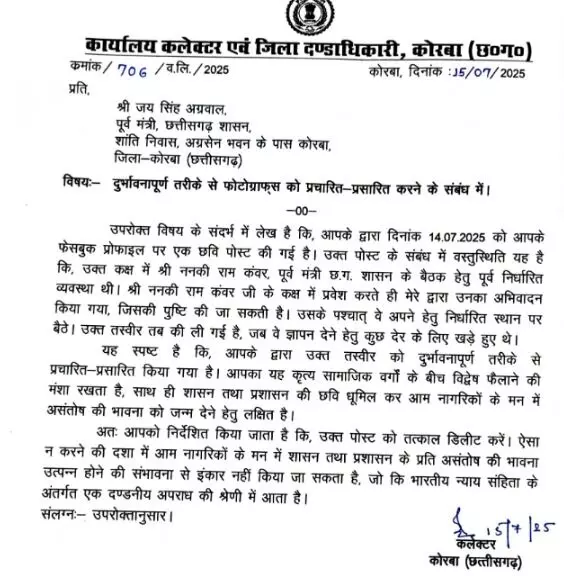 इस फोटो पर पूर्व विधायक ने टिप्पणी भी लिखी है। इसे लेकर कोरबा कलेक्टर अजीत बसंत ने पूर्व विधायक को पत्र लिखकर पोस्ट को दुर्भावनापूर्वक व भ्रामक बताते हुए डिलीट करने की बात कही है। पोस्ट डिलीट नहीं करने पर कानूनी कार्रवाई की चेतावनी दी है।
