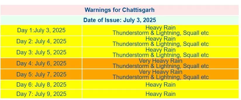 |Chhattisgarh Rain Update : रायपुर, स्वदेश। मानसूनी तंत्र के प्रभाव से शुक्रवार को बस्तर, बीजापुर, सुकमा, गौरेला-पेंड्रा-मरवाही व दंतेवाड़ा जिला में भारी वर्षा की संभावना है। मौसम ने इन जिलों के लिए यलो अलर्ट भी जारी किया है। इसके साथ ही सरगुजा, सूरजपुर, जशपुर और बलरामपुर के कुछ क्षेत्रों में अगले 48 घंटों के लिए यलो अलर्ट जारी किया है।