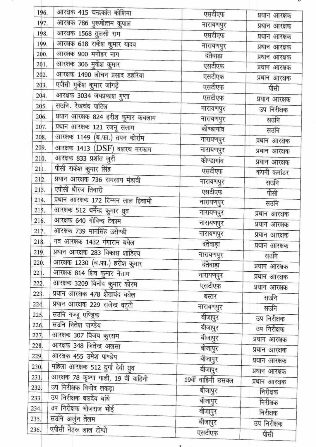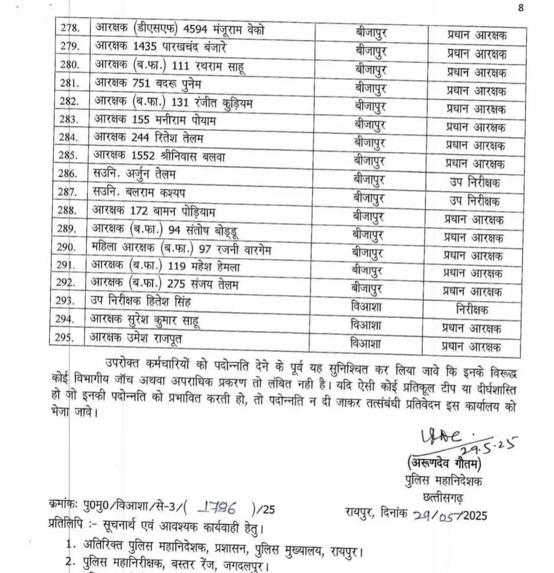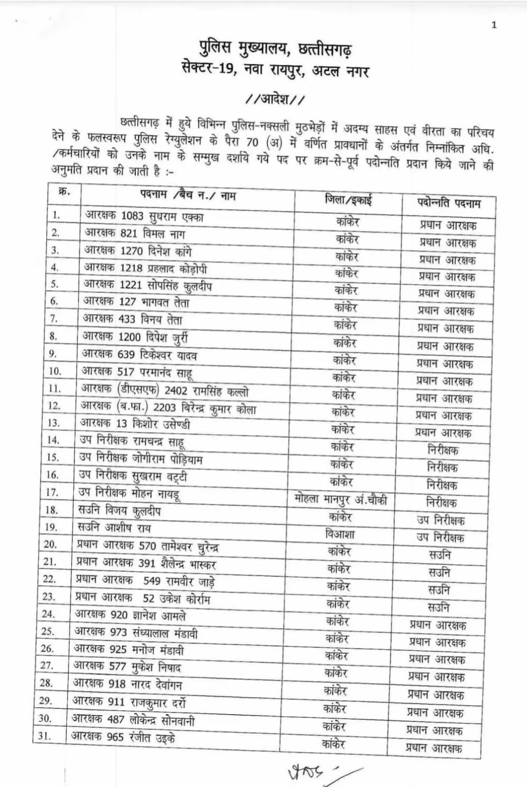 जारी किये गए आदेश में कहा गया है कि नक्सल ऑपरेशंस में बहादुरी दिखाने वाले जवानों को यह प्रमोशन दिया जा रहा है। इसके तहत हवलदार ASI बना दिए गए हैं, कुछ को सब इंस्पेक्टर और इंस्पेक्टर की पोस्ट भी दी गई है।