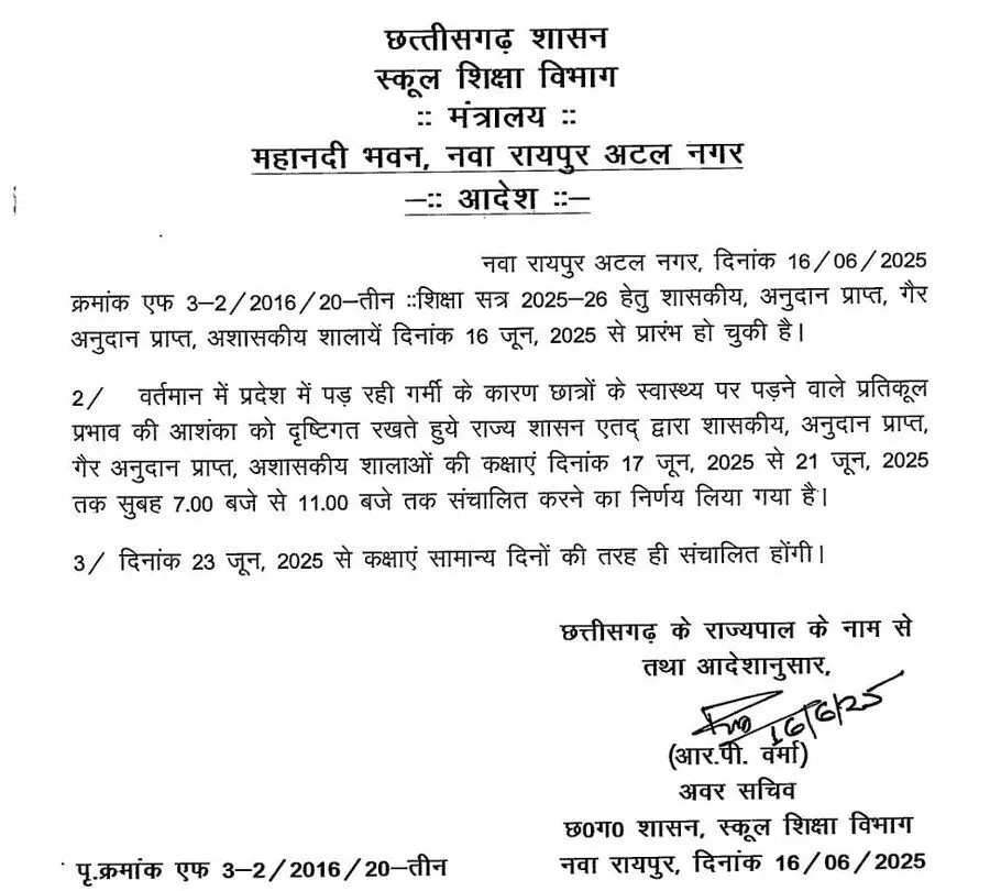 स्कूल शिक्षा विभाग द्वारा जारी आदेश में कहा गया है कि 17 जून से 21 जून 2025 तक प्रदेश की सभी शासकीय, अनुदान प्राप्त, गैर अनुदान प्राप्त और निजी स्कूलों में कक्षाएं सुबह 7 बजे से 11 बजे तक ही लगेंगी। हालांकि मानसून के आगमन के बाद या परिस्थितियों में बदलाव के अनुसार, समय में पुनः संशोधन किया जा सकता है। आमतौर पर सुबह 9 बजे से दोपहर 2 बजे या 3 बजे तक ज्यादा संभावना है।