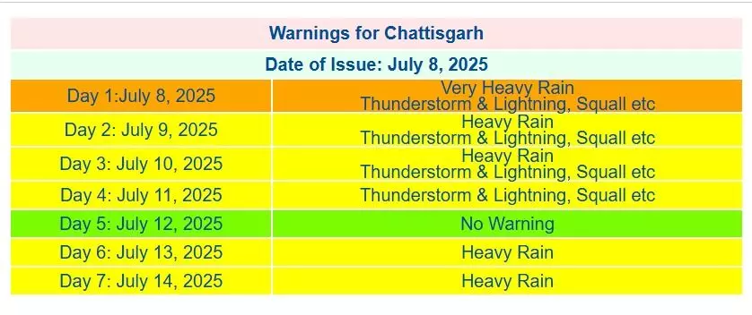 मौसम विभाग ने 8 जुलाई, 2025 को लेकर चेतावनी जारी की है, जिसमें कई इलाकों में तेज बारिश और गरज-चमक के साथ भारी से बहुत भारी वर्षा की संभावना जताई गई है। विशेष रूप से दुर्ग, बस्तर और बिलासपुर संभाग के कुछ जिलों में भारी बारिश का अनुमान है। अगले कुछ दिनों तक हल्की से मध्यम बारिश का दौर भी बना रहेगा।