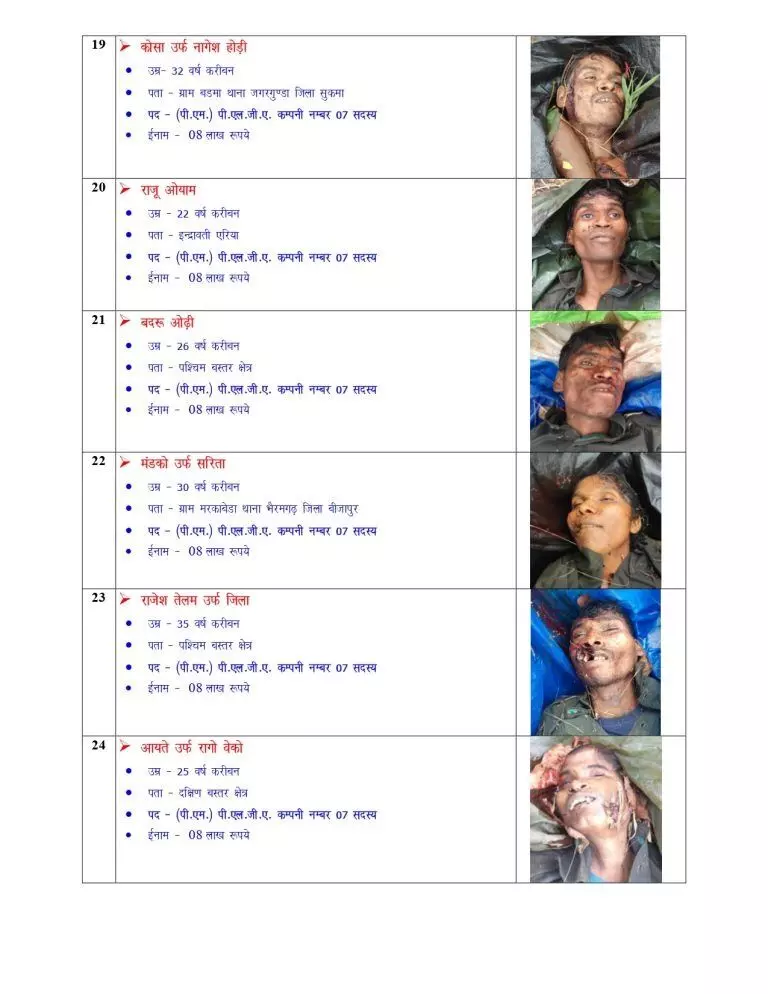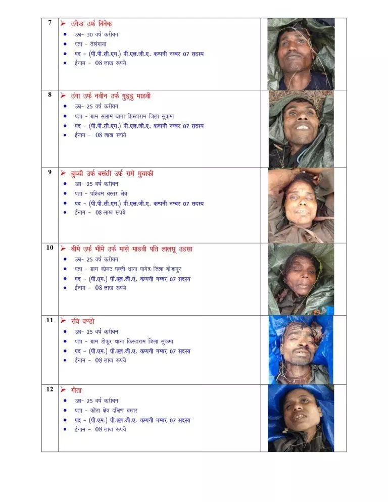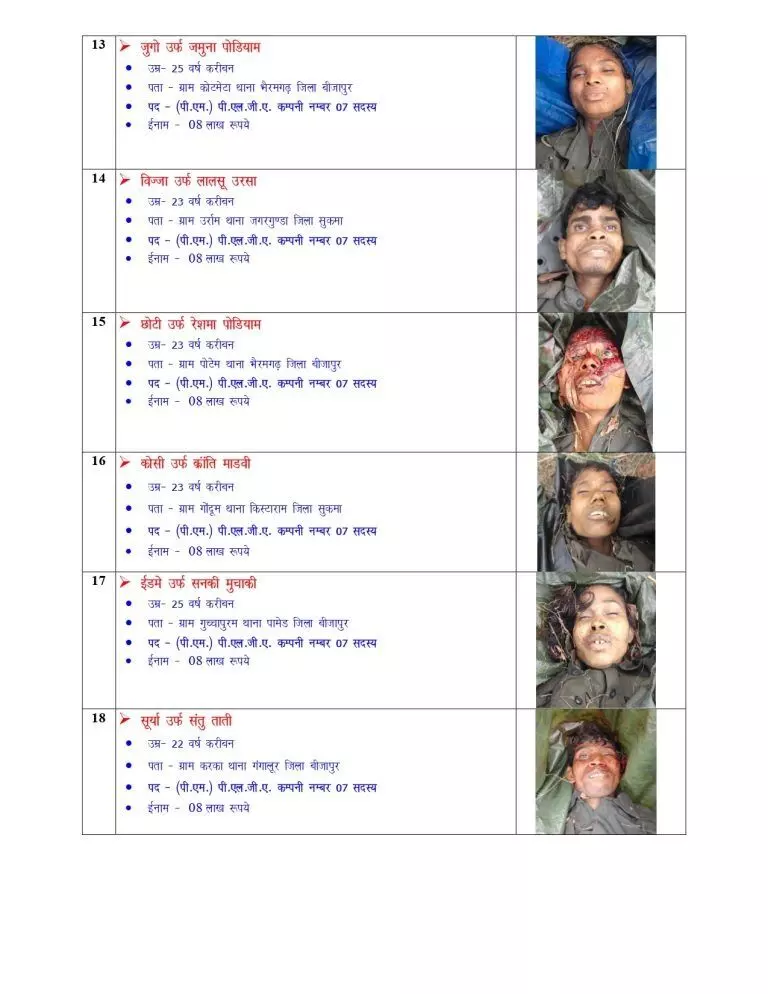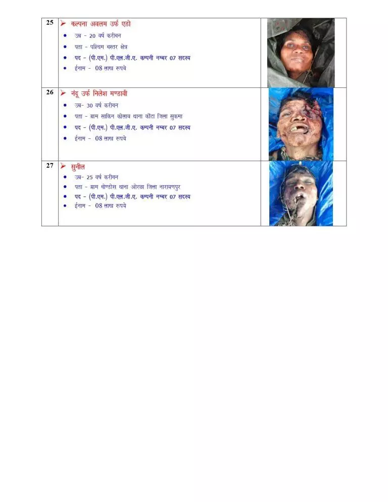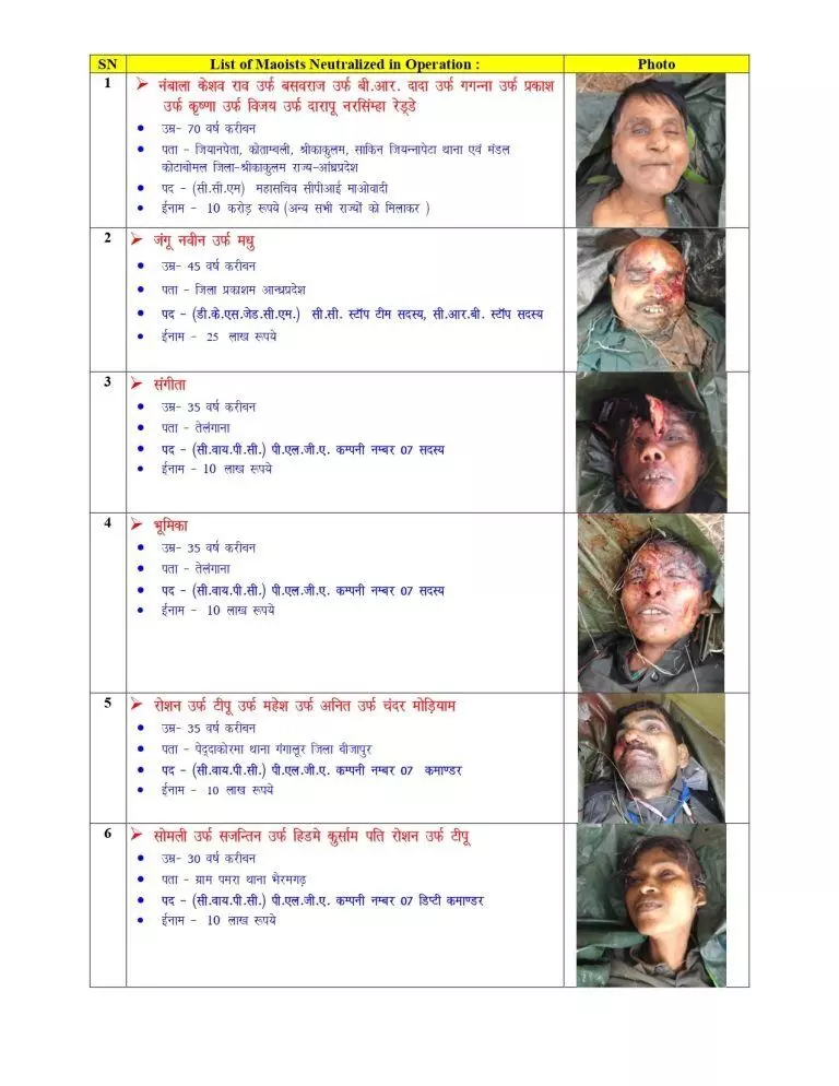 पुलिस द्वारा जारी की गई जानकारी के अनुसार, इनमें से बसवराजू पर 10 करोड़ रुपये का इनाम घोषित था, जो देश के सबसे वांछित नक्सलियों में से एक था. इसके अलावा एक नक्सली पर 25 लाख रुपए, चार पर 10-10 लाख रुपए और 21 नक्सलियों पर 8-8 लाख रुपए का इनाम घोषित था।