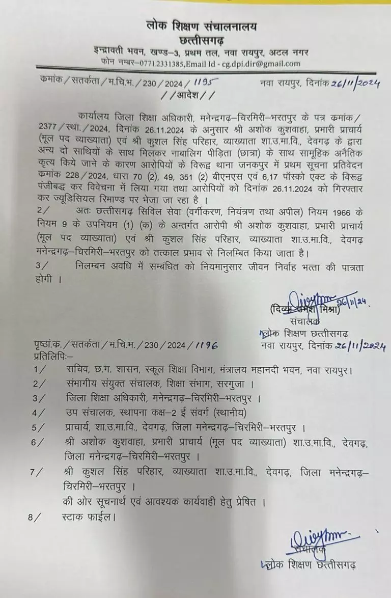 छत्तीसगढ़ गैंगरेप मामला: लोक शिक्षण संचनालय की कार्रवाई, प्रिंसिपल समेत दो आरोपी सस्पेंड