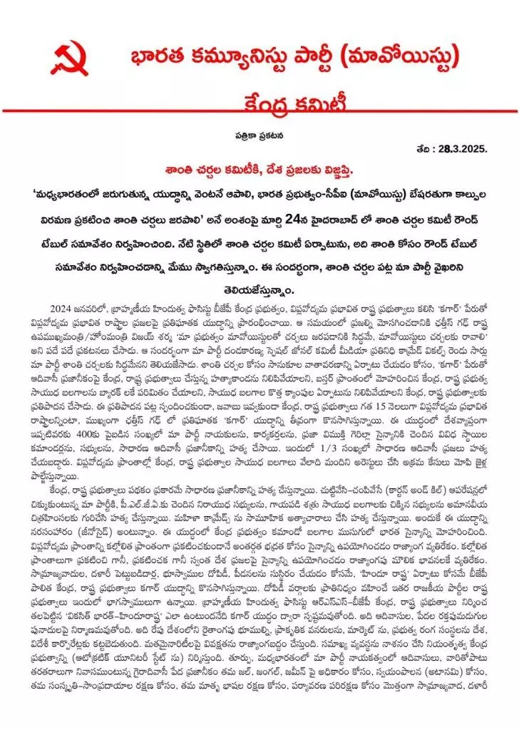 नक्सली प्रवक्ता अभय ने पर्चे में लिखा कि 24 मार्च 2025 को हैदराबाद में संगठन की एक बैठक हुई थी, जिसमें बिना किसी शर्त के शांति वार्ता और युद्धविराम की घोषणा पर चर्चा हुई। उन्होंने कहा कि छत्तीसगढ़ के गृहमंत्री विजय शर्मा ने पहले भी शांति वार्ता की पहल की थी।