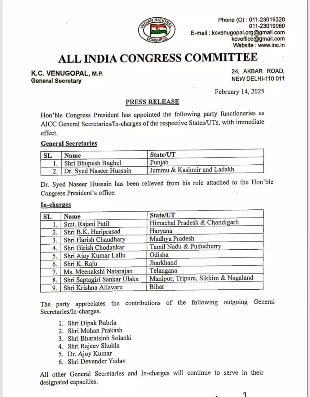 इसके साथ ही 9 राज्यों के लिए नए प्रभारी भी नियुक्त किए गए हैं। मीनाक्षी नटराजन को तेलंगाना का प्रभारी, श्रीमती रजनी पटेल को हिमाचल और चंडीगढ़ का प्रभारी, बी.के. हरीप्रसाद को हरियाणा का प्रभारी, अजय कुमार लल्लू को उड़ीसा का प्रभारी, के. राजू को झारखंड का प्रभारी, सप्तगिरी शंकर उल्का को मणिपुर, त्रिपुरा, सिक्किम और नागालैंड का प्रभारी और कृष्णा अल्लवरु को बिहार का प्रभारी नियुक्त किया गया है।