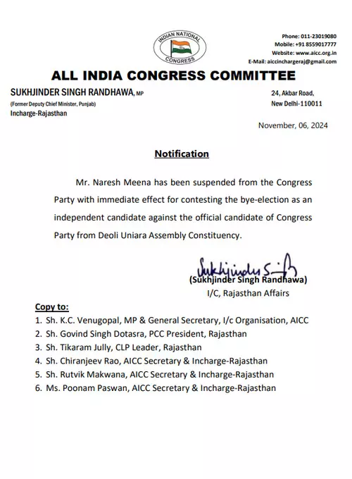 राजस्थान उपचुनाव: कांग्रेस नेता नरेश मीणा निलंबित, देवली उनियारा विधानसभा सीट से हैं निर्दलीय उम्मीदवार