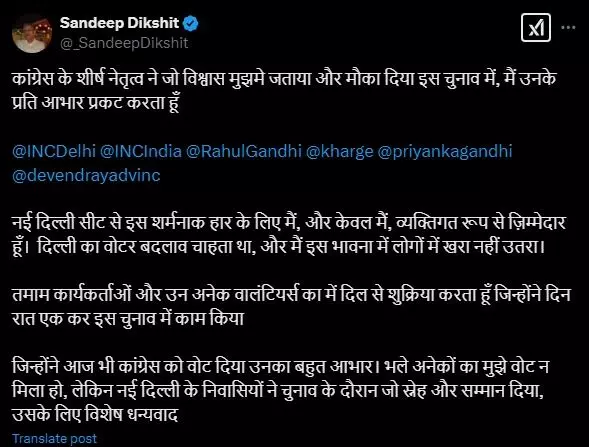 संदीप दीक्षित ने चुनाव परिणाम के बाद सोशल मीडिया एक्स पर पोस्ट साझा कर कहा कि, कांग्रेस के शीर्ष नेतृत्व ने जो विश्वास मुझमे जताया और मौका दिया इस चुनाव में। मैं उनके प्रति आभार प्रकट करता हूँ। नई दिल्ली सीट से इस शर्मनाक हार के लिए मैं और केवल मैं व्यक्तिगत रूप से ज़िम्मेदार हूँ।